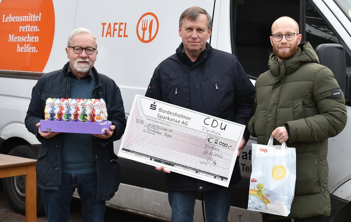 in Flintbek momentan für uns keinen Raum gibt, der groß genug ist. Daher wurde in der Fraktion die Idee geäußert, eine größere Spende zugunsten der Flintbeker Tafel zu tätigen. Ganz besonders liegen uns die Kinder am Herzen. Deshalb erhalten alle Kinder einen Spielzeuggutschein, um sich einen Weihnachtswunsch zu erfüllen. Die Fraktionsmitglieder waren von der Idee sehr angetan und spendeten fleißig von ihren Sitzungsgeldern. Der CDU-Vorsitzende Christian Arp und sein Stellvertreter Carsten Stegelmann übergaben am 12. Dezember an Frank Hildebrand von der Flintbeker Tafel einen Scheck über 2000 Euro. Die Tafel in Flintbek wird zurzeit von ca. 60 Familien genutzt. Es herrscht also ein großer Bedarf. Die CDU Flintbek wünschte allen ein schönes, friedvolles Weihnachtsfest und dankt den unermüdlichen freiwilligen Helfern der Tafel.
